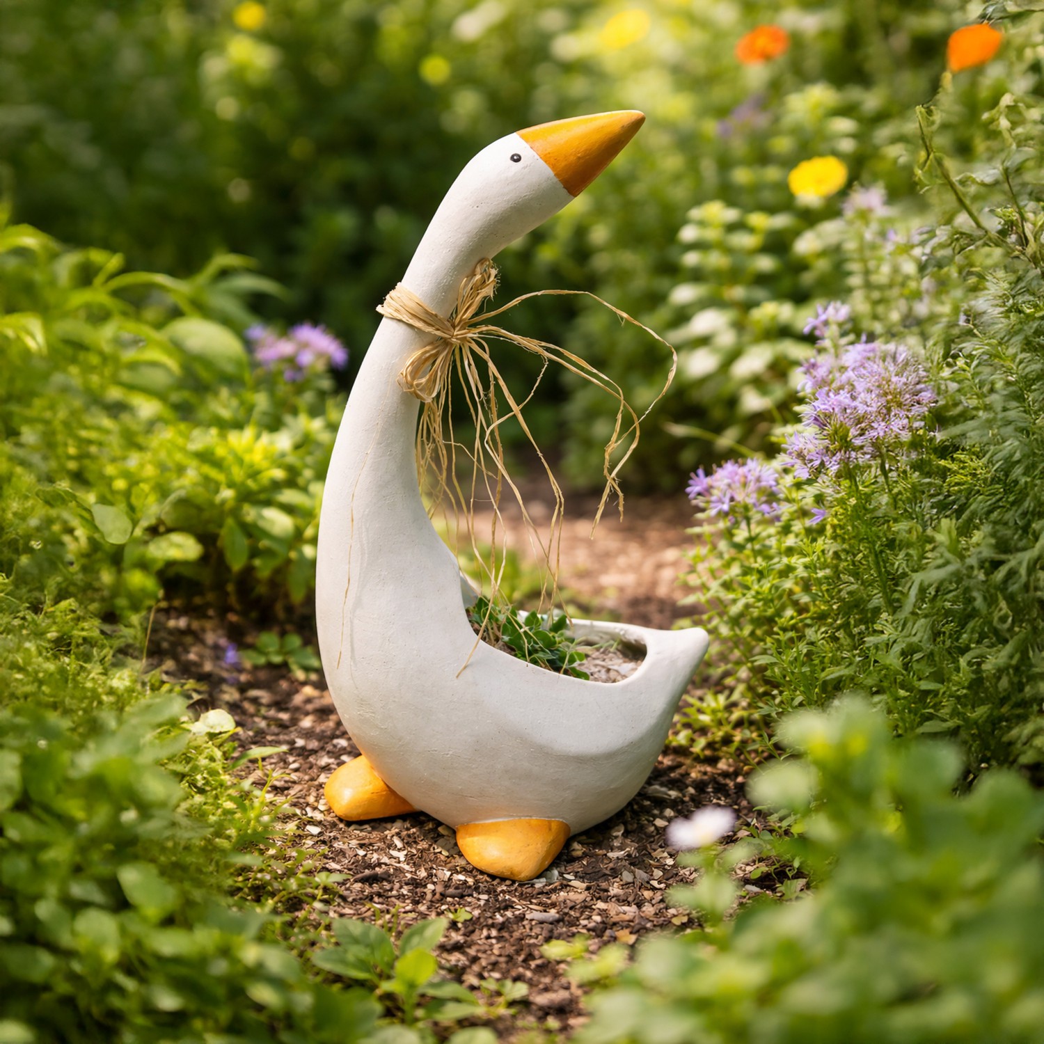 Korpus gęsi pełni funkcję doniczki – idealnej na sezonowe kwiaty, zioła lub niewielkie rośliny ozdobne. Dzięki temu produkt łączy walory dekoracyjne z praktycznym zastosowaniem, tworząc oryginalny akcent na tarasie, balkonie, przy wejściu do domu czy w ogrodzie.