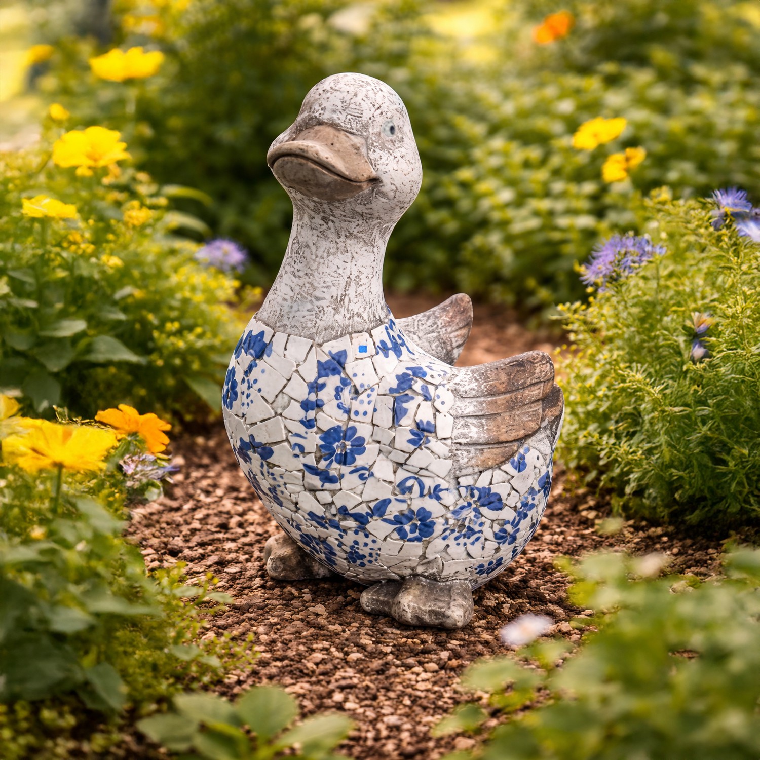 Dekoracyjna kaczka o wysokości 35,5 cm to wyjątkowa ozdoba, która doda uroku każdemu ogrodowi, tarasowi lub wnętrzu. Jej subtelne, postarzane wykończenie oraz niebieski, kwiatowy motyw w stylu mozaiki nadają figurce elegancki, a zarazem sielski charakter.