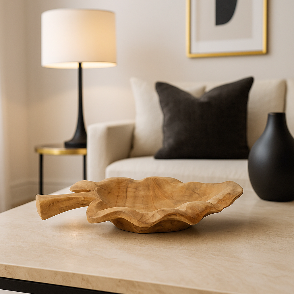 Odkryj piękno i naturalny urok patera-liścia z drewna tekowego od Solis Decor. Ta wyjątkowa dekoracja o wymiarach 42 cm szerokości, 32 cm głębokości i 6 cm wysokości doskonale pasuje zarówno do wnętrz, jak i do ogrodu, dodając elegancji każdemu wnętrzu.