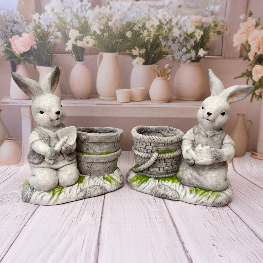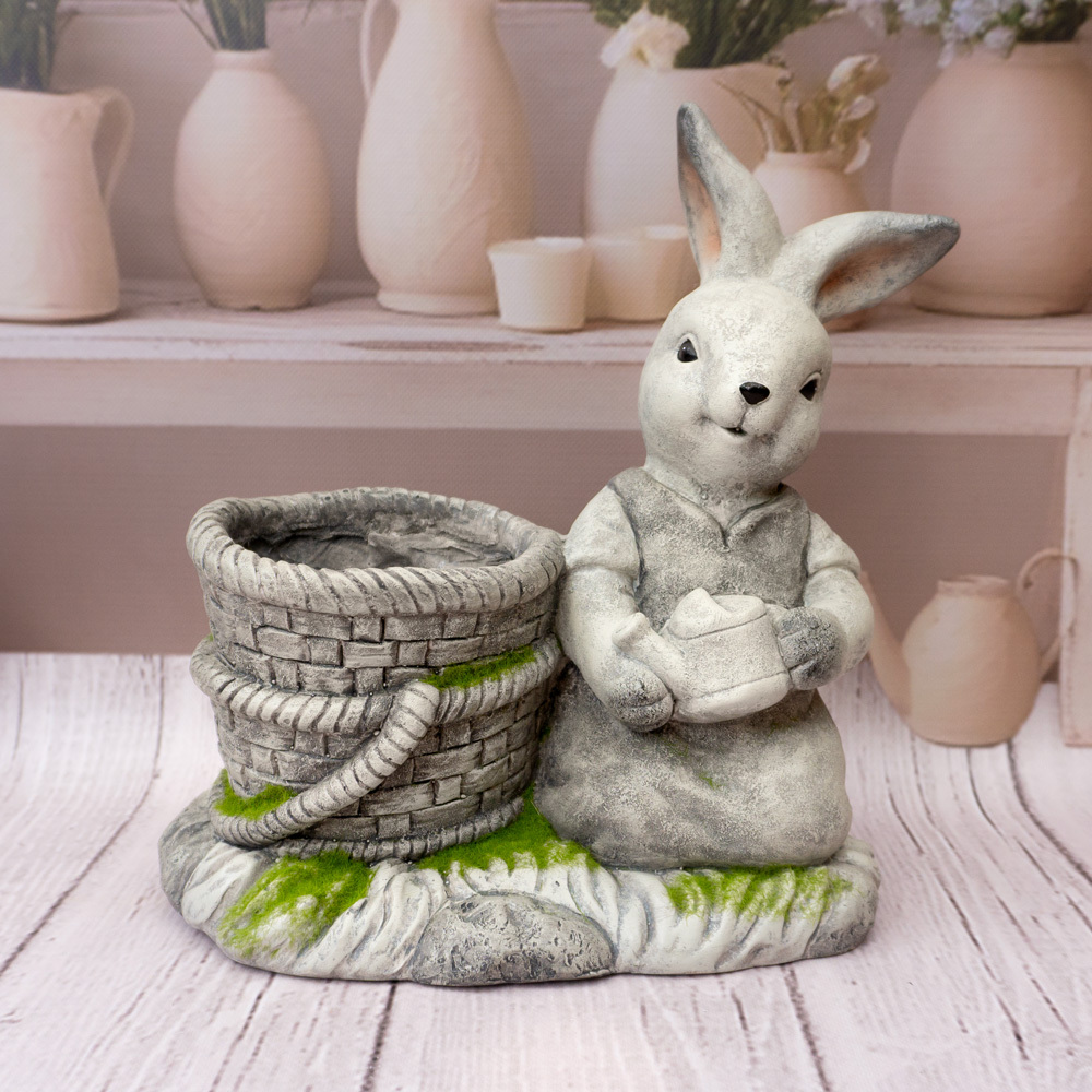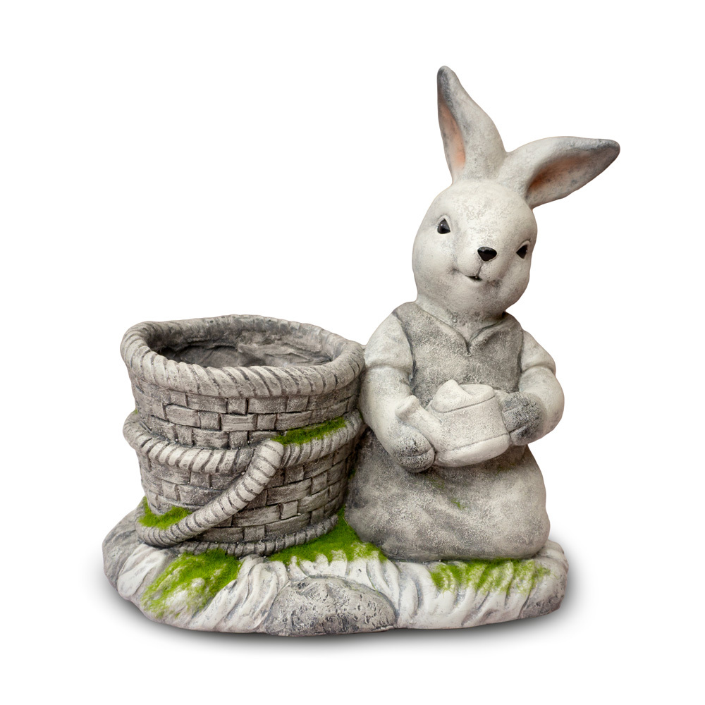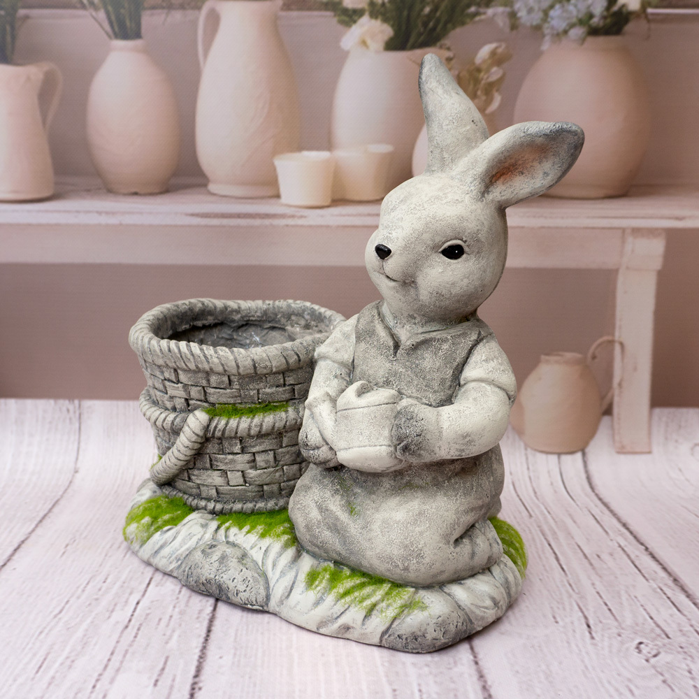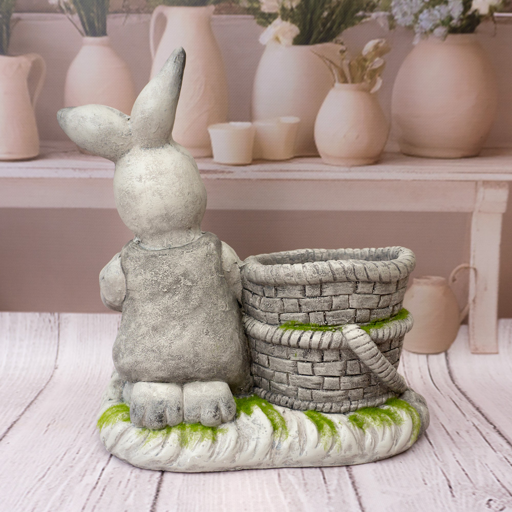 Zając trzyma dekoracyjny kosz, który może pełnić funkcję wyłącznie ozdobną lub posłużyć jako miejsce na drobne dekoracje, kwiaty lub wielkanocne akcenty. Figurka została wykonana z wysokiej jakości materiału, co zapewnia trwałość oraz estetyczny wygląd przez długi czas. Sprawdzi się jako dekoracja do wnętrz, a także na taras czy zadaszony balkon.